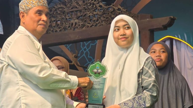 LINGKARBEKASI.COM – Queena Bashaer Aisyah mengukir prestasi membanggakan di ajang Musabaqah Tilawatil Quran (MTQ) XXVII Tingkat Kota Bekasi Tahun 2025. Siswi Tsanawiyah ini sukses meraih Juara II pada Kategori Tilawah Anak, sebuah pencapaian yang menunjukkan dedikasi dan keseriusannya dalam mendalami seni membaca Al-Qur’an.